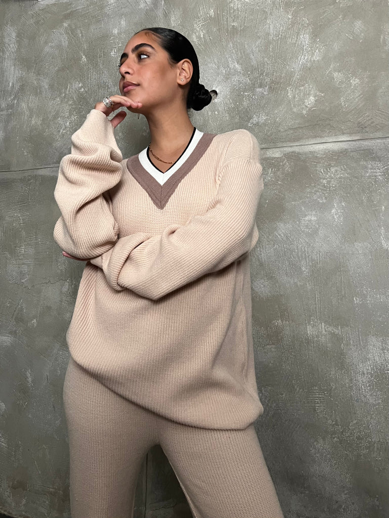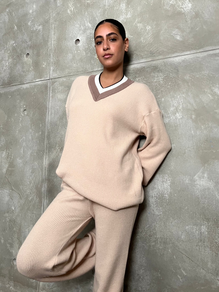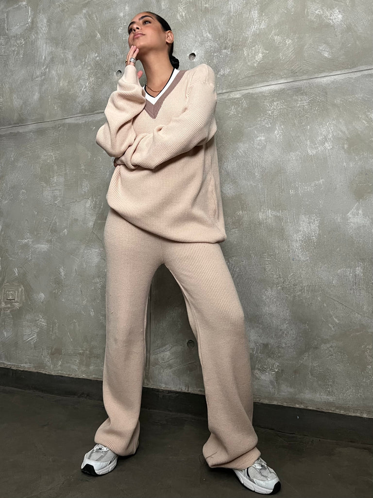 The Double Color V set is a stylish ensemble featuring a vibrant top and complementing pants. This set boasts a unique design with a striking V-shaped pattern that seamlessly blends two contrasting colors, creating a visually captivating and modern look. The top offers a flattering fit, while the pants are tailored for comfort and sophistication, completing an ensemble that's perfect for making a bold fashion statement. Whether for a casual outing or a special occasion, the Double Color V set effortlessly combines style and elegance.